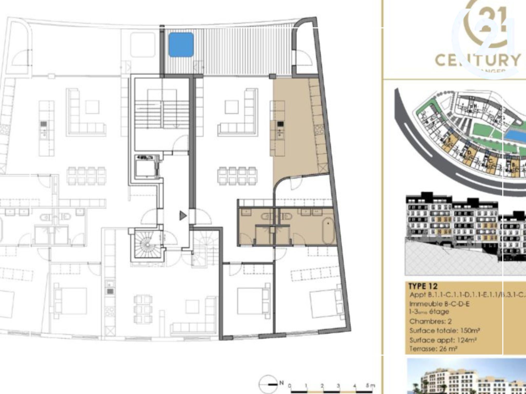 Blocs C, D et E : appartements de 149 m², 150 m² et 154 m², situés entre le 1er et le 3e étage