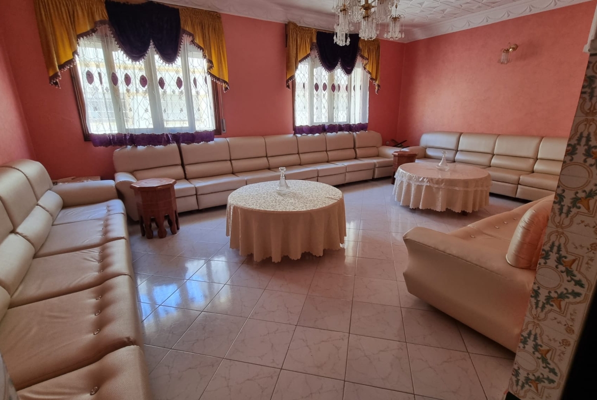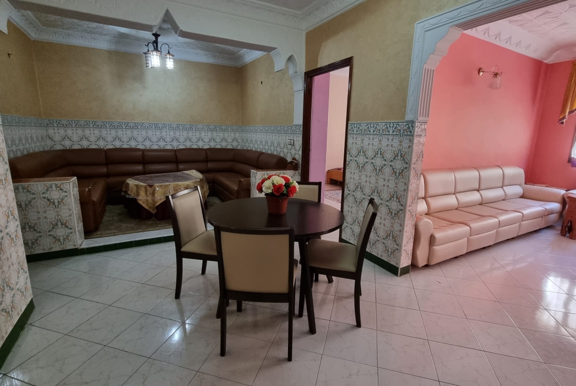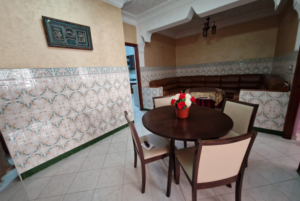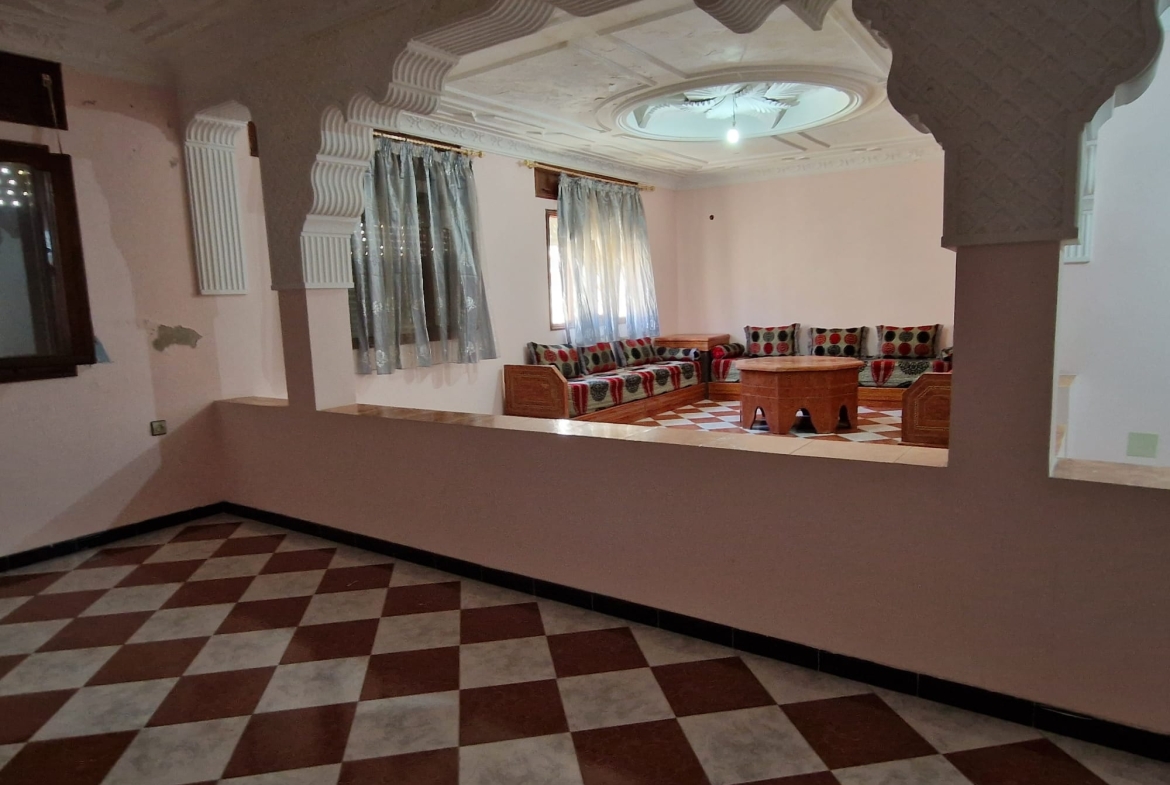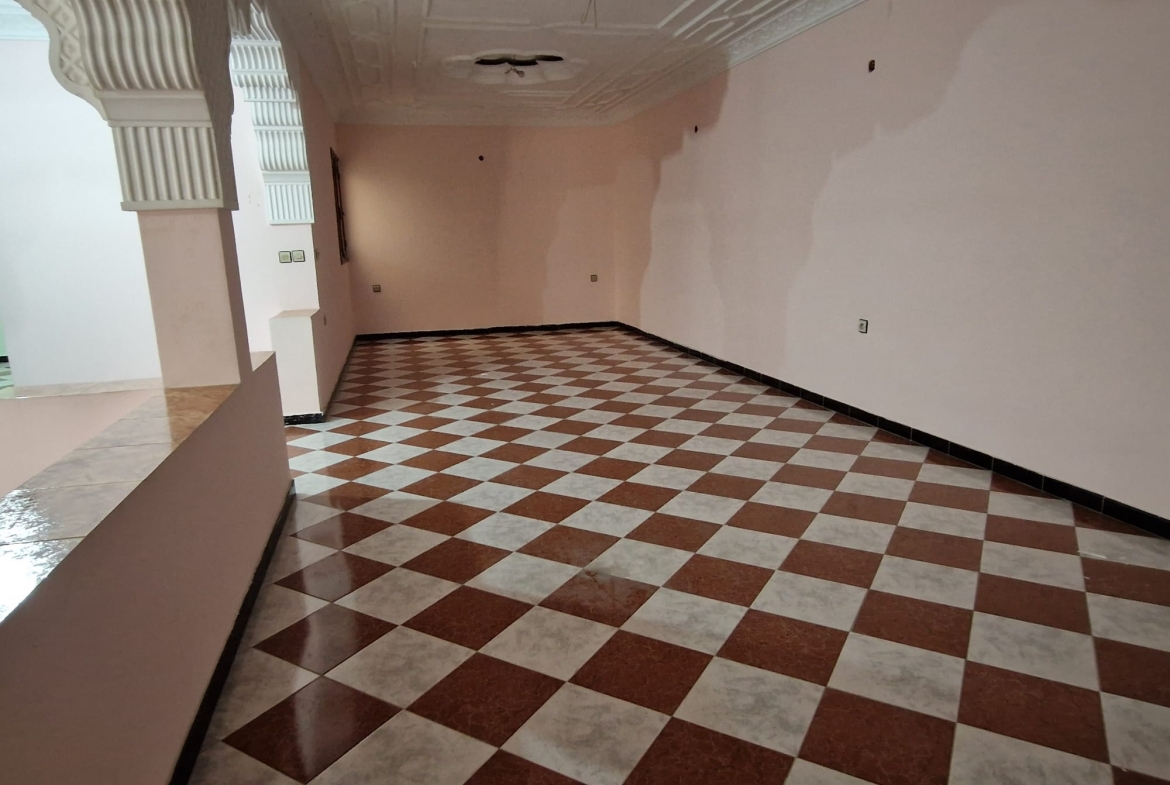 Une grande maison de 123 m² dans un quartier calme (EZZAOUDIA) à vendre.la maison est composée de 2 étages, retrait et un garage. Le premier étage contient : 2 salons, salle à manger, cuisine, salle de bain et une petite terrasse. Le deuxième étage dispose d’un grand salon, une chambre et une salle de bain, et le retrait : 2 salons, salle à manger, cuisine et salle d’eau. La maison dispose de son propre garage privatif.